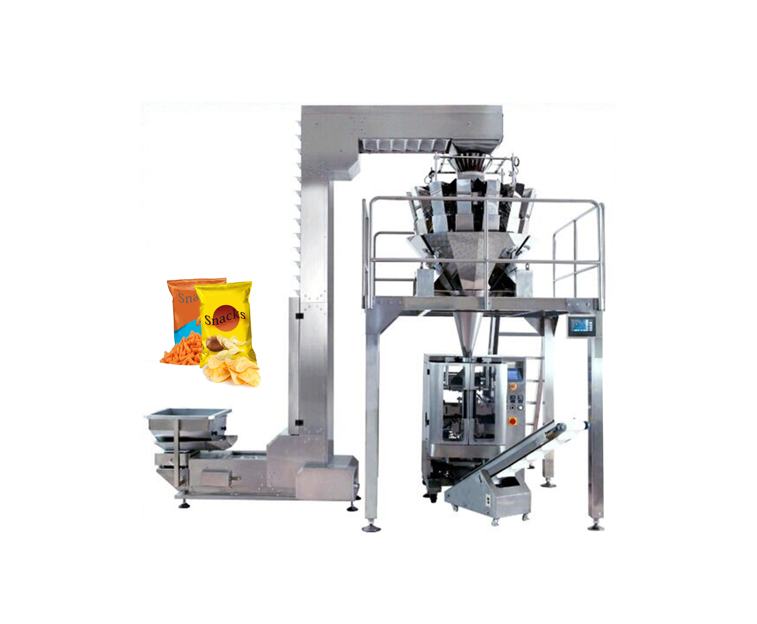 Maquina Empacadora de Snacks, tamaño de la bolsa longitud 100 ~ 380 mm / ancho 100 ~ 300 mm, poder 4 Kw / 200v trifásico / 60Hz, velocidad de empacado 10 ~ 50 bolsas/min, dimensiones (largo x ancho x alto) 2800 x 2400 mm, rango de peso de empacado 30g / 460g